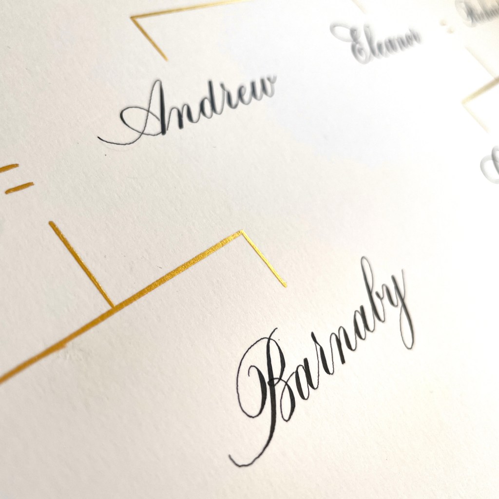 Verses, vows, and family trees calligraphed in Copperplate or Modern Calligraphy.